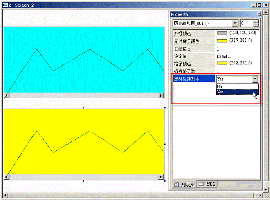 (2)建立打印元件,依照画面编辑动作,建立各个元件,如果需要打印历史数据以及历史曲线,则要在设定属性栏将【资料连续打印】的属性设置成【yes】,如图5所示。