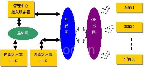 控制中心管理软件采用C/S结构,将GIS系统、TCP网络通信、SQL数据库操作结合起来,整个系统使用一个接入服务器和多个客户机,可以多台计算机在不同地方查看不同的车辆的状态。