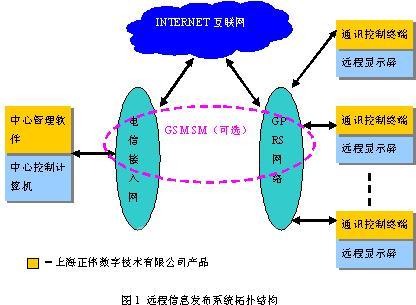 显示屏设置在需要发布信息的各个远程位置,每个显示屏均配置一个信息发布终端,信息发布终端通过SM或者GPRS与中心计算机通信。采用GPRS方式时,终端通过GPRS方式连接到INTERNET互联网,同时,用于发布信息的计算机也通过专线、ISDN、ADSL、拨号等多种方式连接到INTERNET网络,通过互联网的沟通连接,中心计算机就可以以TCP/IP的方式与各个显示屏进行集中的数据传输和发布,无论显示屏是否放置在同一个城市、同一个区域,都可以在管理中心集中进行廉价的信息发布,实现信息发布的统一管理和维护。
