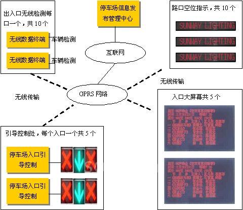 本停车场无线信息发布系统包括15个信息显示点,1个信息发布管理中心,5个引导路线控制中心,15个引导指示牌,10个车辆信息采集点。