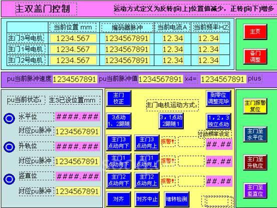 输送站在传送运行过程中,门的运动控制是项目关键。根据图5所示门控结构,门的移动过程,从低水平位到竖直过程即为打开过程。主门靠三个电机(主3,主1,主2)运动来实现开关。如图门的三个位置分别为低水平位,升轨位,竖直位。在低水平位为关门,主1,主2,主3先同步运动到升轨位,然后主1,主2停下,主3继续向上运动把门拖到竖直,这时为开门。关门过程为:主3拉门到升轨位,然后主1,主2,主3同步运动到低水平位,关门结束。下图为门的独立操作画面。门的开关过程用到了VE变频器的定位和同步功能,主3的运动靠定位模块01PU控制,主1 主2分别对主3做跟随或脱离,充分展示了高性能矢量变频器VE的定位和同步优势。
