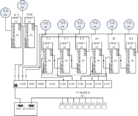 控制系统选用中达全系产品,系统配型为:PLC平台选用台达DVP64EH00R2(主机)+2*DVP08HN11R2(数字量扩展)+DVP04AD-H2(模拟量扩展)+4*DVP01HC-H2(高速计数扩展)+2*01PU-H2(定位模块)+AE10THTD(人机界面)+8*VFD-VE+8*PG01O(编码器反馈卡)。