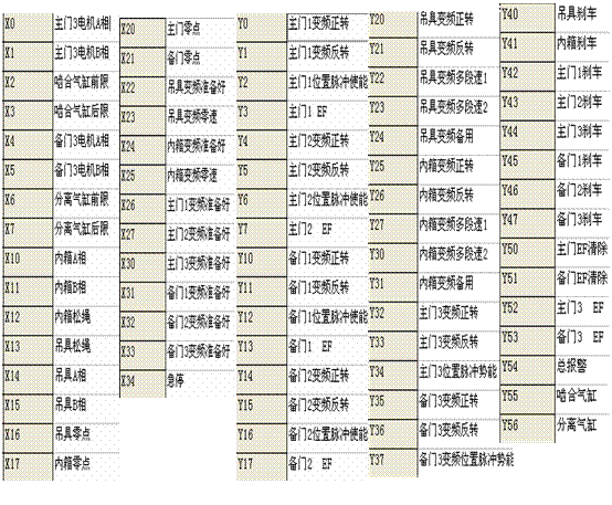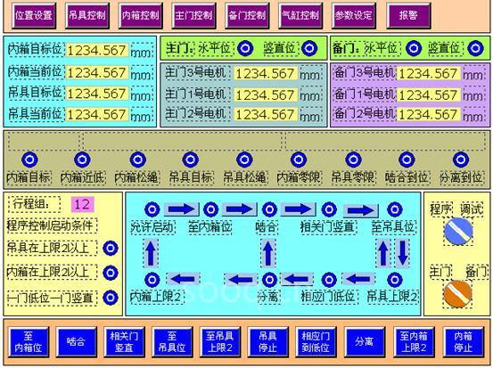 图4为主控页面。当条件允许满足 内箱运动到指定位置即低位,是否到低位由红外开关检测,分别装在内箱的四个角上,检测信号进入模拟量模块04AD,这样也用来判断箱子下来时候是否平直。到低位之后气缸齿合,相应门竖直后,吊具可以带上物件到指定位置,然后进行回复运动。因为在可能传送一些带辐射的物料,所以在传送过程也频繁的开关门,运动过程在一个密封罩内进行。