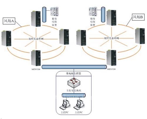华能昌邑风力发电站位于山东省昌邑市下营港海湾沿岸。在该项目中共有风力发电机组33台,每台风力发电机需配用一个箱式变电站来将发电机所发出的690V交流电升压为37KV传输至主控变电站的主变再升压为110KV交流电后,发送给各城区110KV或者220KV配电站。这样每个风机配用的箱式变电站内部需要一个箱变综合测控装置来实现在变电站主控室对各节点风机箱变的运行情况进行监控和必要的控制。但各个风机节点之间以及风机与主控变电站之间的距离较远,需要采用光缆来组建信息网络,实现通讯。每个风机节点之间以及风机节点与主控室之间通过光缆组建光纤冗余双环网,采用迈威光电MIEN5208网管型工业以太网交换机。风机节点直线距离600M,使用多模光缆连接,风机节点与主控室直线距离2KM,采用单模光缆连接。所有33台风机节点组成两个双环自愈网A、B,其中A环1#风机和B环7#风机内各安装2台单/多模光口5208交换机,其中多模光口与风机节点连接,单模光口与主控室连接。其余各风机节点使用一台多模交换机。主控室对应两个双纤环网使用两台单模交换机作为网络的局端对整个网络经行网管控制。各风机节点箱变综合测控装置的3遥——遥信、遥测、遥控信号通过MIEN5208交换机与主控室的主控PC实现通讯。
