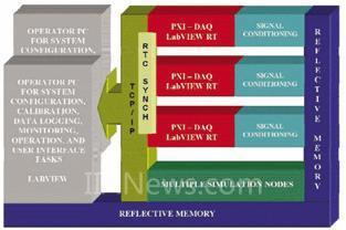 使用多个NI PXI机箱和各种具有模拟和数字I/O端口的NI 模块、ARINC-429硬件,集成在微软Windows平台上开发的高效LabVIEW和LabVIEW 实时模块,以及由反射内存卡和TCP/IP组成网络的PXI节点。