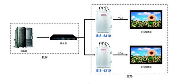 在多媒体信息播放系统中,华北工控BIS-6310作为显示屏的控制器,通过VGA连接到显示屏的背面,众多BIS-6310共享一个服务器,BIS-6310通过网络与服务器连接并接受和更新播放内容。
