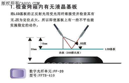 光纤传感器应用-检查烤箱内有无液晶基板 将LCD基析的正反射光用受光用纤维接受并检查其有无,因为定位点大,所以即使基析上有一些不平也能实施稳定的动作。数字单元:FF-20 光纤型号:FFTB-410 嘉准光纤传感器采用德国进口自动研磨设备加工;主要有φ2、φ3、M3、M4、M6;光纤芯有φ2.2,φ1.0,φ0.5;凸管从φ0.5-φ6,从1mm-150mm;全系列光纤1008种.漫反射光纤,同轴光纤,矩阵光纤,侧视光纤,对射光纤,特殊光纤,耐高温玻璃光纤,光源光纤(特殊规格可定做;可完全替代OMRON欧姆龙,SICK施克,SUNX神视,YAMATAKE山武,KEYENCE基恩斯,BANNER邦纳,TAKEX竹中,Autonics奥通力,等知名国际品牌)另可订做各种特殊型号,承接OEM订单。 |