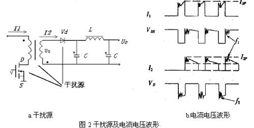 如图2b所示,I1是变压器初级线圈电流,I2是二次线圈电流,VDS是开关管漏源极间电压,VD是二次侧输出二极管上两端电压。开关管关断时产生频率为f1的干扰,而输出二极管反向电流引起频率为f2的干扰。