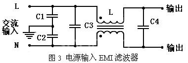 在电源进线端通常采用如图3所示电路。该电路对共模和差模纹波干扰均有较好抑制作用。
