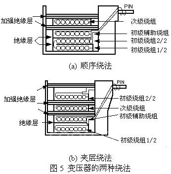变压器的结构设计和绕组分配。如图5,变压器有两种常见的绕法:顺序绕法和夹层绕法。顺序绕法一般漏感为原边电感量的5%左右,但由于初,次级只有一个接触面,原副边间杂散电容较小。夹层绕法一般漏感为原边电感量的1-3%左右,但由于初,次级有两个接触面,原副边间杂散电容较大。漏感是产生干扰的重要因素,原副边间杂散电容是干扰的传播通道,为抑制干扰,既要减小漏感又要减小原副边间杂散电容。因此,设计时应综合考虑这两个方面进行设计,具体采用何种绕法应该根据实际情况而定。