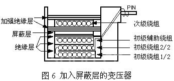变压器的屏蔽层。在EMI干扰较强的情况下,常在变压器的初次级之间加入一层屏蔽层,如图6,通过加入屏蔽层切断了初次级间杂散电容的路径,让其都对地形成电容,其屏蔽效果非常好,可以大为减小EMI,同时对于电网串入的瞬态干扰也有一定的抑制作用。但变压器的制作工艺和成本都上升。屏蔽层有铜层和绕线层两种,铜层的效果最佳。