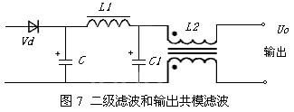 为了增加对干扰的滤波效果,可以在电源的二次输出侧加入二级滤波和一个共模电感。如图7所示,L1,C1组成二级滤波电路,滤除差模干扰;L2是输出共模电感,滤除输出电压中所含有的共模干扰。