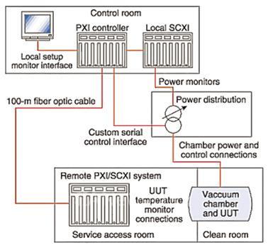 洛克希德马丁的工程师们与NI 公司合作,设计出了双机柜的基于PXI 的系统(请看图2),它可以控制热真空室,并且进行必要的测试。然后,洛克希德马丁公司委托Cal-Bay Systems 公司来实现他们的设计。