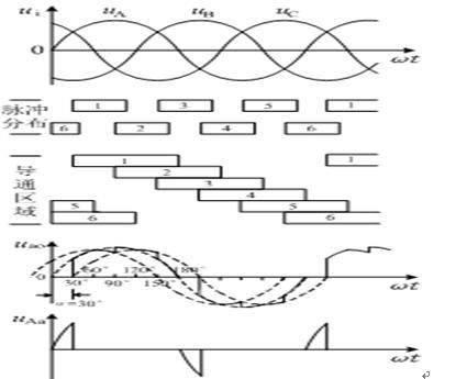 图2给出了a=30°的触发脉冲位置和各晶闸管的导通情况。
