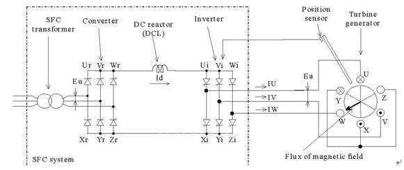 逆变器运行原理如下:在起动之初和低转速(约10%转速及以下)时,当发电机没有足够的电压输出实现逆变器的换相时,逆变器换相通过脉冲方式运行来实现。在发电机加速到足够的转速并产生足够的电压以便逆变器换流后,逆变器运行在负载换流方式,于是输出交流电使发电机加速旋转。