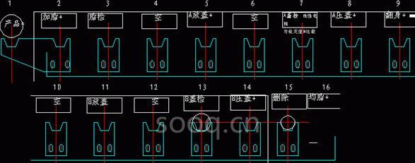 自动循环过程各工位除了要根据触摸屏内设定的工位选择条件执行外,还要依赖脂检、盖检的结果自动选择后续工位是否执行。譬如,如果某产品做A面盖检后发现不合格,则此不良品移至后续的工位时,动作都不执行,在删除工位进行不良品删除。