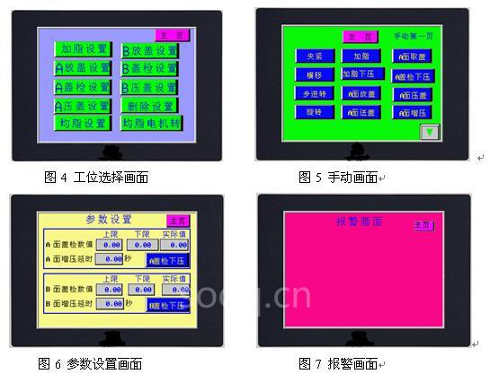触摸屏主要实现人机交互,对轴承加脂加盖机器进行工位开或关选择,负责系统的在线监视、控制、调试、维护。完成数据显示、数据分析和操作保护三类功能,可分为以下几个方面:
