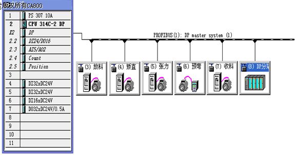摘要:本文介绍了S7-300PLC通过PROFIBUS-DP通讯方式控制MM440变频器,配合人机界面,结合工艺要求,实现了铝管在线退火的完美控制。 关键词:S7-300PLC MM440变频器 PROFIBUS-DP通讯 一、项目介绍 1.简介 苏州奥智机电设备有限公司一直致力于空调用铜、铝管加工设备的研发、设计、制造及服务,为用户提供高性价比的卓越产品。其研制的在线退火设备是近年来开始在铜、铝管加工行业中大量应用的设备,与传统的辊底炉相比,占地面积仅为四分之一,而且节省工序,省却了传统的在退火前缠绕的工序,降低了管材消耗和在工序过程中的擦伤。管材的成品率高,数千米长的盘管上废管只有1-2米,产生在整盘管材的开头部分,能实现盘到盘的加工流程,极大地提高了生产效率。 该设备采用S7-300PLC结合人机界面通过PROFIBUS-DP通讯协议实现对MM4变频器的速度控制,整个电控系统体系简明,布线简单可靠,控制运行准确平稳,收到了良好的效果。 2.简要工艺介绍 在线退火设备用于将料篮装载的硬态管通过在线感应加热方式退火成软态管。在连续运行过程中,将置于保护气体氛围中的管材通过中频感应加热,使其温度达到480度左右,再通过保温区(确保在一定的温度下有时间在加热后进行全晶粒的匀化并消除管子表面的褪色),进入到快速冷却区(即将冷却水直接喷淋到加热后的管材上使其快速冷却),将附着在管材表面的水通过吹干装置吹干后进入到履带式自动张力装置,使管材在行进的过程中一直保持一个合适的张力,然后经过抺油处理后进入到收料篮中。 外观示意图如下: 1. 系统硬件 1) PLC 2) HMI 3) 变频器 此项目中放料和收料都由交流变频电机通过减速箱驱动料篮高速旋转,属于大惯量系统,而且要求很高的起动转矩;通过采用MM440的无速度传感器矢量控制方式,可以获得接近闭环控制的性能,速度精度可达0.2-0.5%,同时省去了速度传感器,具有较低的维护成本。与传统V/Hz控制比较,无速度传感器矢量控制可以获得改进的低速运行特性,变负载下的速度调节能力亦得到改善,同时还可获得高的起动转矩,这在高摩擦与惯性负载的起动中有明显的优势。正是由于这些驱动特性,此项目选择了MM440变频器。 2.控制系统主要器件 电源模块 6SE7 307-1KA00-0AA0 2块 3.系统配置 根据以上的选型,组成了如下的控制结构图:
