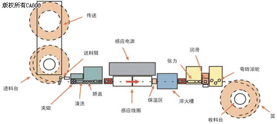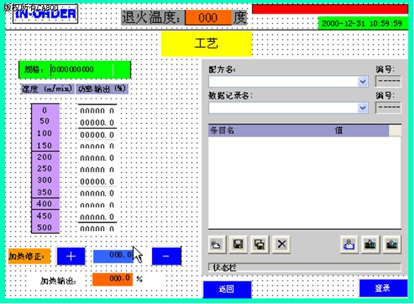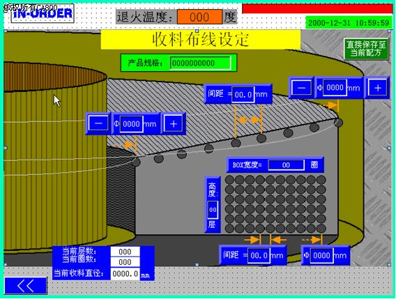 主要思路是先在料篮底部构建一个BOX区域,然后在BOX区域的上面让管材在更宽的区域里排放,最终使其形成一个三角形的形状,在这种状况下,会使下一道工序的生产更加顺畅。下面来阐述一下实现的过程: 收料是一个速度跟随系统,其线速度表达式为V=K×n÷I×D 由上式可推导出,在V、K、I都不变的情况下,D与n成反比关系,通过改变D即可改变n。均匀布料实现方法:按照管材所处料篮直径D(D是料篮每转一圈都发生变化的)计算出n作为电机给定速度,电机给定速度有规律的变化使管材的排放有序进行。 BOX区域构建: 收料处装有一个接近开关,在机组运行过程中实时地检测料篮转动的圈数(N)。根据在触摸屏中设置的“BOX管材排放外径”(D1)和“间距”(D2),先从右至左排放,其实际直径D=D1-D2×N,当N=“BOX宽度”时,层数加1,N清零,并将D赋值给D’;然后开始从左至右排放,其实际直径D=D’+ D2×N 。如此循环,直到累计层数=“BOX高度”,则此区域构建完成。 三角形构建: BOX区域上方的排放方式同上,只是其宽度更广(“上层管材排放内径”与“上层管材排放外径”区间为其排放区域);由于其底下是一个宽度比它小的矩形(并不是一个十分规则的矩形区),超出矩形宽度部分的管材会自然掉落在料篮的底部,在矩形宽度内的部分会向上堆积,由此形成三角形状“⊿”。 通过在HMI中设置相应参数,用户可以自行调整BOX区域的大小,以及上层区域的宽度及排放的紧密度,由此完美地解决了用户的需求。在触摸屏中也设置了相应的观察项(图中的白底部分),如当前层数,当前圈数,当前收料直径,便于针对具体管材排放情况对参数设置进行修改。 5.为了保证退火时管材表面温度的恒定,感应加热功率输出的设定必须跟随管材运动的实际线速度及管材规格,由于铝管规格很多,在HMI中运用配方功能来实现,某一规格一旦调试好后下次用户只需调用即可,非常方便,如下图所示: