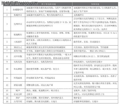 目前国内交流调速的主流,还是转子串电阻调速,变频调速占比重较小,而且主要还是同步机的交交变频调速,国内的四象限交直交高压变频器调速技术是在2005年后发展起来的新技术,并且产品迅速成熟,很快成为未来提升机调速的发展趋势,表1是转子串电阻调速和变频调速的比较。