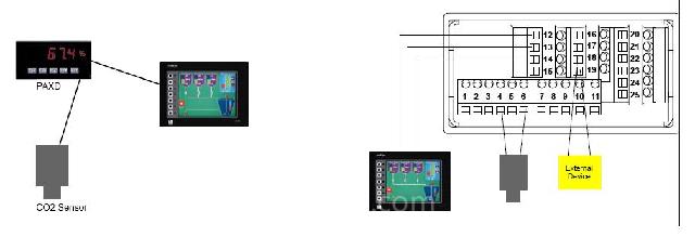 PAXD多用途DC输入表能够读出CO2传感器的输出(传感器输出为DC值),用PAXD为比例因子,很方便地使原始值变成便于阅读的所需显示,采用G310触摸屏后,相应数据所以从PAXD中被读到G310中,并且G310能够修改设定PAXD中的模拟量输出值,达到监视/控制CO2的浓度。