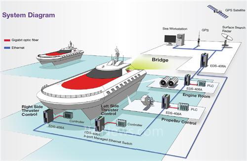 由EDS-408A管理的以太网交换机部署在桥面及机舱。与螺旋桨及侧边推进控制一起形成一个环形数据传输网络。桥面上的EDS-408A连接至配有19”LCD面板的工作站。基于电脑的工作站可连接不同类型的记录器及传感器,在屏幕上显示信息,进行计算,处理不同的海洋学及气象学数据。该系统允许驾驶员在接近码头时获取有用的实时信息并平滑安全地操作船只。