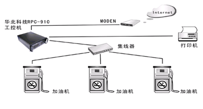 如图,我们假设管控机管理下有三台加油机在运作,他们由一台集线器连接,并通过 RS-232与管控机进行联接与通讯。管控机是整个系统的大脑,它一方面负责对加油的信息进行管理和控制,另一方面负责把收集到的信息进行整理备份,通过调制解调器( MODEM)实现数据的上传和通讯。为了保证系统的顺利运行,位于系统中心地位的管控机必须满足以下要求: