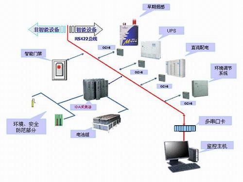 监控系统由三个部分组成,端局的数据采集部分、把采集的数据传送到中心的传输部分、对各端局的采集数据进行处理的监控计算机及其软件部分,本次监控系统的结构如下图所示: