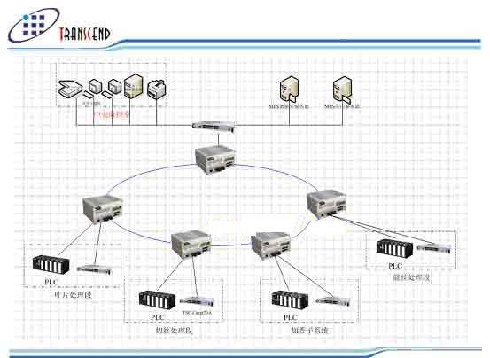 系统分站:加香子系统、混丝处理段、叶片处理段、切丝处理段的四个分站系统各挂装主干结点TSC Carat55系列交换机,星型下联现场级网络设备——TSC Carat20系列工业以太网交换机 ,通过设备层网络交换机与系统终端进行通讯。
