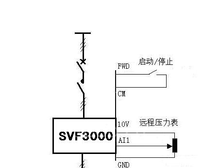 图2中SVF3000变频器的10V DC电源,专门用于过程控制系统的检测装置的供电电源。AI1是模拟量信号(反馈输入和模拟量给定值)输入端,GND端子为公共端。