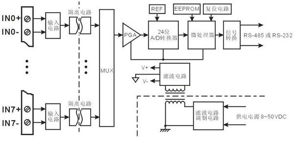 ISOAD A08是基于单片机的智能监测和控制系统,所有的用户设定的校准值,地址,波特率,校验和状态,通讯协议,通道状态等配置信息都储存在非易失性存储器EEPROM里。