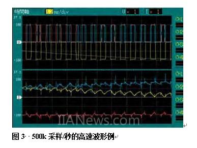 此外,3390还具备以X-Y图表显示来确认变频器的动态特性的功能,变频器不可或缺的谐波测量功能,用FFT评估影响变频器的干扰的功能(可达100kHz)等(图2)。而且,利用3390的500k采样/秒的高速采样率,来显示电压/电流波形(图3)。之前,需要使用数字示波器和差分探头、钳式电流传感器来观测波形,非常麻烦,现在1台3390即可实现。