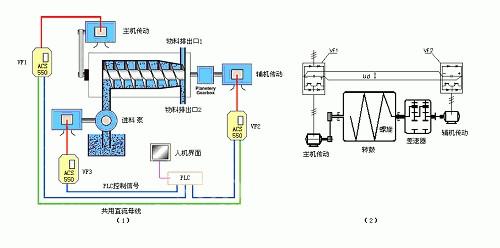 从发展趋势看,卧螺的传动已经从能耗严重的涡流制动发展到目前最主流的双电机双变频驱动。如图二所示,典型的卧螺离心机中有两个传动轴:一个轴带动筒体转动、另一轴带动筒轴转动,两者的转速需要精确的配合。变频矢量控制针对不同液体浓度自动适应负载变化,高效可靠的完成离心分离过程。具体的分离控制功能则被集成在PLC离心机控制软件中。从接线方式看,交流电网接到主变频器的进线端,两变频器的直流母线直接并联辅机传动变频器并不直接接驳进线380V,这样就可以方便而可靠地实现能量共享。在正常运行情况下,辅机都是处在发电状态,主电机则是在电动状态,辅机发电导致母线电压泵升,然后通过母线互联,将泵升电压消耗在主机上,从而减少了从电网吸纳的电能,起到了节能的作用。