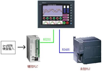 (1)系统架构。系统由主辅两套PLC和台达触摸屏构成人机操作界面。台达10.4' 高亮度 TFT LCD触摸屏DOPA10THTD1的3组串行通讯端口,具有同时连接不同的通讯格式控制器能力,本案同时接入两台不同品牌的PLC,构成异构集成自动化系统,如图2所示。
