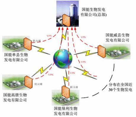 国能生物发电有限公司科技部希望通过远程监控方式,在北京总部远程监控各地每一个生物发电子公司的生产运行情况,该项目要求各子公司和总公司之间通过INTERNET公网来实现数据通讯。