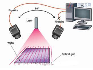 在德国斯图加特举办的Vision 2008, Tordivel展示的离线的机器视觉系统,旨在测量太阳能电池片的曲度。“离线系统需要一个操作员手动加载每个晶圆,” Vollset说 “生产版本的系统将允许晶圆通过生产线自动拍摄和统一衡量,也就是一个在线检测系统” 。 Vollset和他的同事开发出一种系统,采用了三维成像技术来衡量晶圆的一致性。在晶圆被置于系统下方,StockerYale公司的Lasiris激光将发射11个细激光线到晶圆表面。 两个Flea2 140万像素相机分别与竖直方向成30 °放置,用来捕捉两个图像投影线(见图.2 )。图像通过PCI – Express的1394采集卡传输到个人电脑主机上。