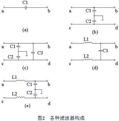 几种滤波器的构成如图2所示。在图2(a)中,阻抗Z=1/(ωC1),高频区域用陶瓷电容、聚酯薄膜电容并联,其滤波效果更好。图2(b)中,噪声能通过电容旁路到地线上,这种滤波器连接时应使接地阻抗尽量小。图2(c)中,C1、C2对不对称噪声有良好的滤波效果,C3对对称噪声有良好的滤波效果,连接时应使电容器的引线及接地线尽量短。图2(d)为常用的噪声滤波电路,L1、L2对噪声呈现高阻抗,而C1则对噪声呈现低阻抗。当L1、L2采用共模电感结构时,对对称和非对称噪声都有较好的滤波效果。图2(e)适用于共模噪声进行滤波,应注意的是其接地阻抗同样应尽量小。
