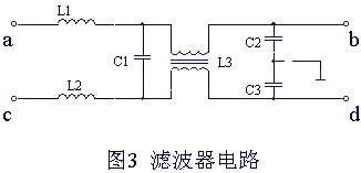 图3是对共模噪声和差模噪声都有效的滤波器电路。其中,L1、L2、C1为抑制差模噪声回路,L3、C2、C3构成抑制共模噪声回路。L1、L2的铁心应选择不易磁饱和的材料及M-F特性优良的铁心材料。C1使用陶瓷电容或聚酯薄膜电容,应有足够的耐压值,其容量一般取0.22µF -0.47µF。L3为共模电感,对共模噪声具有较高的阻抗、较好的抑制效果。