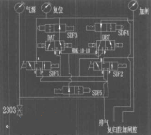 ①自动运行方式:手动操作阀SDF1、SDF2 在中间关闭位置,手拉阀SDF3、SDF4、SDF5 在开启位置。开机时,电磁阀DBT 动作,将加闸腔接通排气管,加闸腔排气,180s 后,电磁阀DAT 动作,将复归腔接通压力管,风闸落下;停机时,电磁阀DAT 动作,将复归腔接通排气管,复归腔排气,180s 后,电磁阀DBT 动作,将加闸腔接通压力管,风闸顶起。