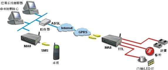 在本例,在每栋大厦顶楼安装MA8-2系统,并将终端设备如磁簧、警铃、电动门锁及LED警示灯等透过TTL与MA8-2连结,使用者透过手机控制警戒状态,将手机号码作为个人ID, MA8-2会辨识使用者是否为合法授权人员以控制警戒状态,有任何动静MA8-2会立刻经由 GPRS 网络透过Internet 自动回报控制中心,并同时以简讯在第一时间通知相关管理人员做紧急处理。本系统不需传统Alarm Panel、Keypad、Alarm Receiver等众多设备,且可於非常短时间内建置完成,实为各集成商最佳解决方案。