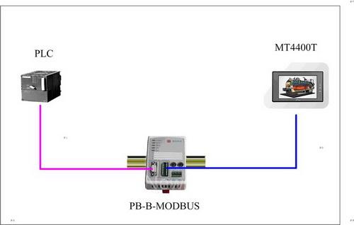 在Profibus-DP网络中,西门子PLC(带有DP通讯功能)作DP主站,PB-B-MODBUS作DP从站; 另外,在Modbus网络端,eView(为MT4400T为例)触摸屏作Modbus Master,PB-B-MODBUS作Modbus Slave。(如图1-1所示)