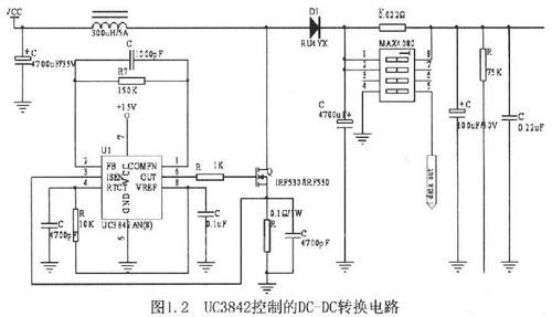 由UC3842设计的DC-DC升压电路直接用误差信号控制电感峰值电流,间接地控制PWM脉冲宽度,达到控制输出端电压的目的。开关管以UC3842设定的频率周期开闭,使电感L储存能量并释放能量。当开关管导通时,电感充电,把能量储存在L中。当开关截止时,L产生反向感应电压,通过二极管把储存的电能释放到输出电容器中。输出电压由传递的能量多少来控制,而传递能量的多少由通过电感电流的峰值来控制。具体设计电路如图1.2所示。