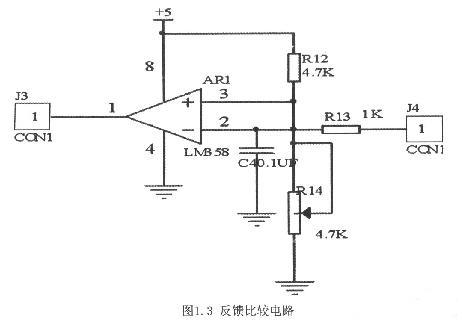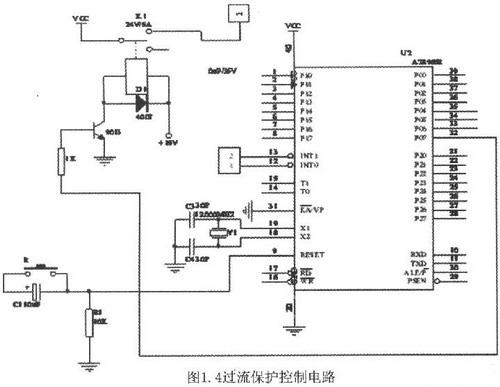 在大电流的情况下容易损坏芯片,所以需要对大电流的情况给予电路保护。设计中采用单片机控制的通断来控制电路中的电流,对输出电路电流采样,采样值与额定值比较,反馈比较电路如图1.3所示,当电流大于2.5A时,则产生信号使单片机进入中断处理程序,使继电器起动,实现DC-DC电路的断电,从而达到保护电路的作用。单片机控制电路如图1.4所示。该方案中单片机控制继电器的吸合时间短,而且易于实现。