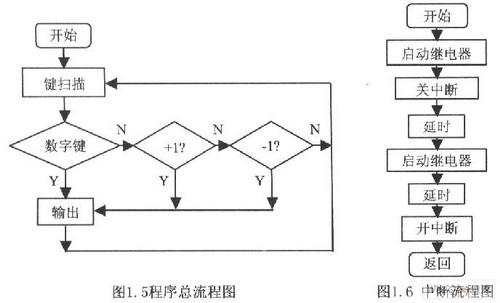在设计好相关电路的基础上,通过编程由单片机对开关电源进行智能控制。系统由单片机AT89S52控制,电源系统具有"+‰"和"-"步进功能,步进幅度为1V。同时AT89S52结合等电路实现了电路过流保护功能,并且能实时显示开关电源的输出电压和电流。程序总流程图和中断流程图如图1(5,6)所示。
