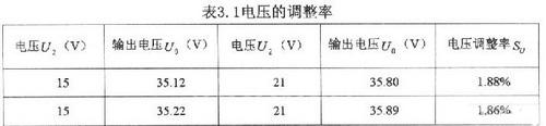 电压调整率SU指U2在指定范围内变化时,输出电压U0的变化率。用自耦调压器调节U2从15V到21V之间变化,在输出电流为2A时候,测量出输出电压,从而得到电压调整率SU。