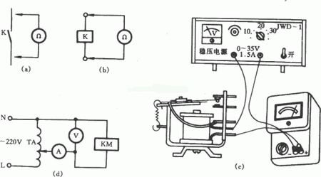 (4)测量交流接触器、中间的吸合、释放电压、电流。如图(d)所示,将调压器TA接通220V电源后,调动调压手轮。电流表A、电压表V指示值逐渐上升,当听到“咔哒”一声接触器(或中间继电器)吸合时,A值为吸合电流值,V值为吸合电压值。然后调动调压手轮使电压下降,当听到“叭”的接触器释放声时,A表指示值为释放电流,V表则为释放电压值。如果线圈是380V的,则需要用两只调压器串联,以获得较高的试验电压。