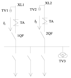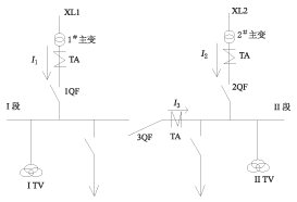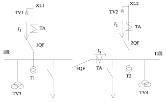 该接线为单母线分段,一般在农网配电系统、小型化变电所或在厂用电系统中使用,图3所示的备用自投方案接线是热备用接线。XL1和XL2中只有一个断路器在分位,另一个在合位,因此当母线失压,备用线路有压,并I1(I2)无电流时,即可跳开1QF(2QF),合上2QF(1QF)。该热备用方案的自投条件类似于内桥断路器的自投方案中热备用方式1和方式2的自投方式条件。即母线无电压,线路XL2有电压,I1无电流,1QF确实已跳开,合上2QF。或者母线无电压,I2无电流,线路XL1有电压,2QF确实已跳开,合上1QF。