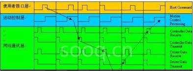 3. 运动控制层 - 必须有一个同步于SSCNET的运动控制系统,负责将这些指令放到SSCNET.masterIC 并且将各轴信息.masterIC 取回。这个控制系统在PC based上有两种作法:第一种是利用一颗微处理器接.masterIC 的控制周期中断,并于固定的时间内将该周期的运动命令计算出来并送.masterIC。当然同时间也必须读.masterIC上的信息,这颗微处理器是独立于PC之外,通常会设计在外围控制卡上,以凌华的 PCI-8372而言,是采用TI的浮点运算DSP。另外一种是利用PC上的CPU接.masterIC 的控制周期中断,同样的,必须于固定的时间内将该周期的运动命令计算出来并送.masterIC,以工研院机械所开发的SSCNET-N601而言,是采用VenturCom的RTX开发环境,前者的好处是稳定且方便机台设计者使用,后者的好处是机台设计者可以直接控制SSCNET,但必须考虑同步问题。