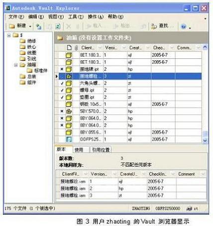 对于多用户引用同一个文件的情况,在同一时刻只能允许一个用户对文件进行编辑,被编辑的文件一定是被该用户检出的。在Autodesk Vault 浏览器中,各用户对零部件的检入、检出情况都可以看到,每次修改的时间、用户名、版本号都有记录,甚至每个版本的内容都有保留。图3是用户zt(zhaoting)登录Vault 浏览器后看到的油箱设计中,零部件的检入、检出情况,√是被用户zt本身检出,×是被用户hp检出而用户zt不能修改的文件。