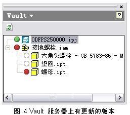 用户对检出的零部件修改完成并检入Vault服务器后,Vault服务器中对应的零部件版本号将自动加1。在图4中用户hp对“接地螺栓.iam”文件进行了修改,用户xjf引用了该文件,当后者打开“接地螺栓.iam”文件时,在Inventor内部的Vault浏览器下出现红色圆点提示,这时用户xjf点击右键更新后就可以获得Vault服务器上对应文件的最新版本。